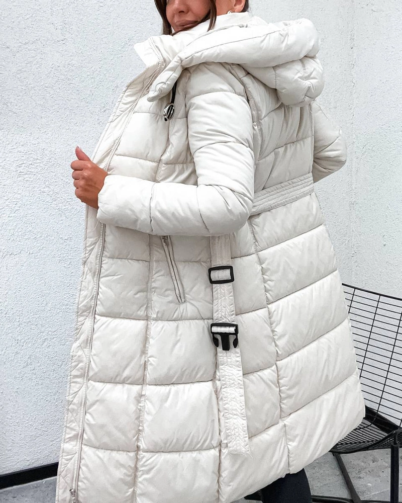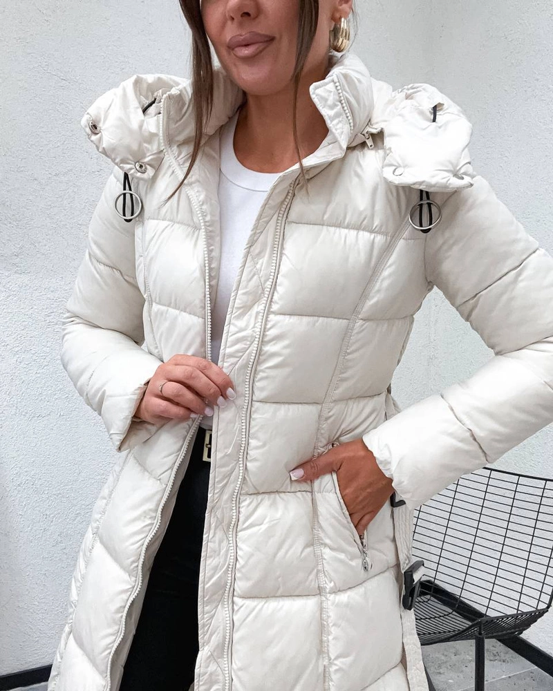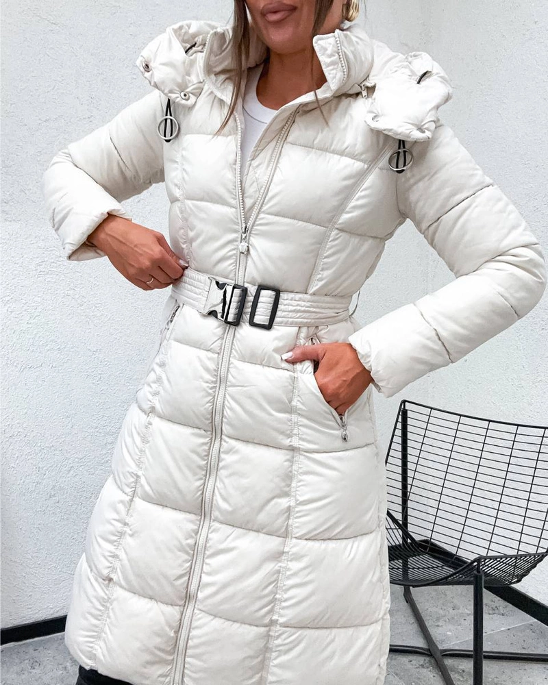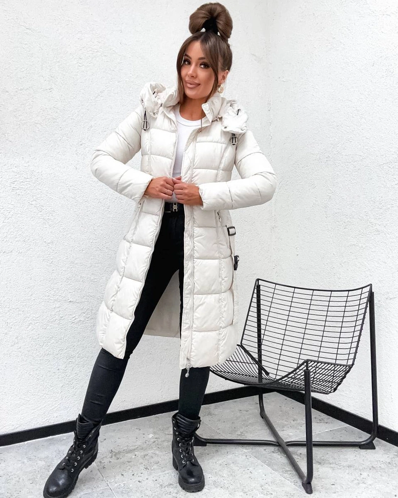 Stylowa, pikowana kurtka zimowa o taliowanym kroju, ocieplona puchem syntetycznym dla maksymalnego komfortu. Posiada odpinany kaptur, dwukierunkowy zamek oraz pasek z klamrą, który podkreśla sylwetkę. Dwie kieszenie i długość do kolan zapewniają funkcjonalność oraz doskonałą ochronę przed zimnem.
