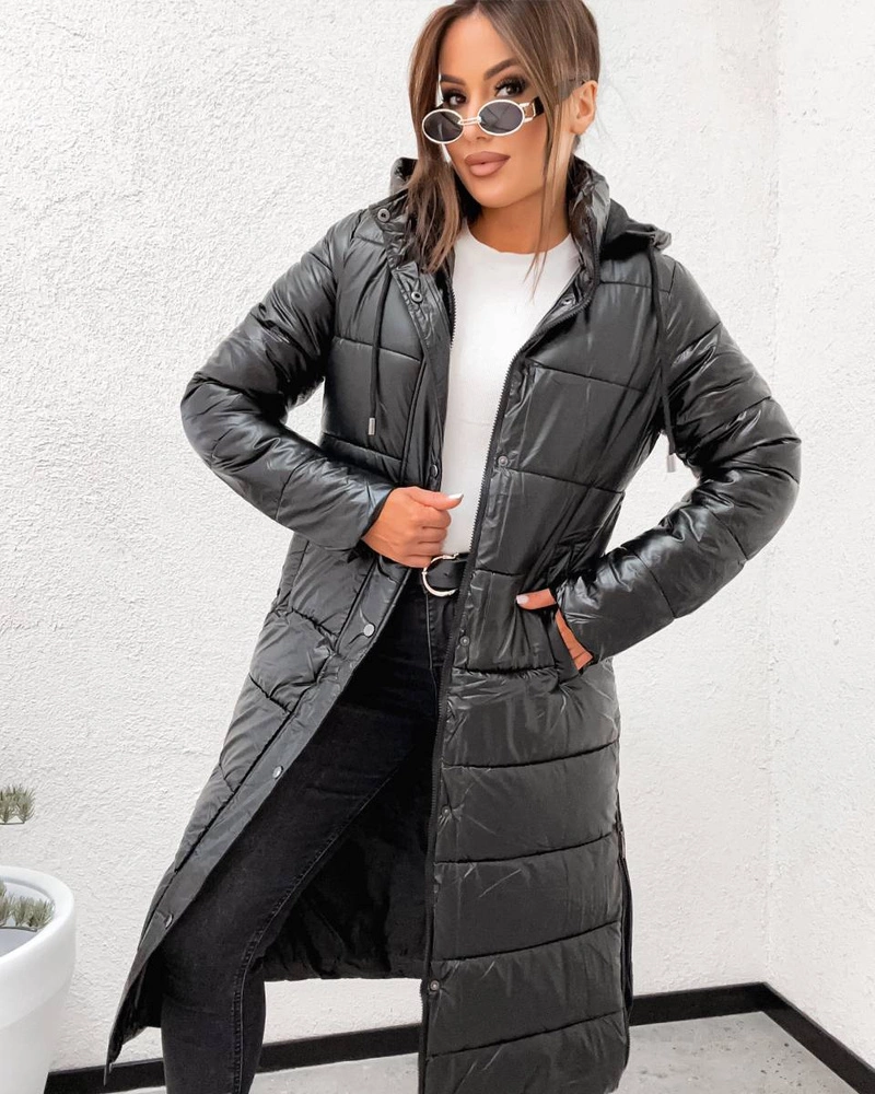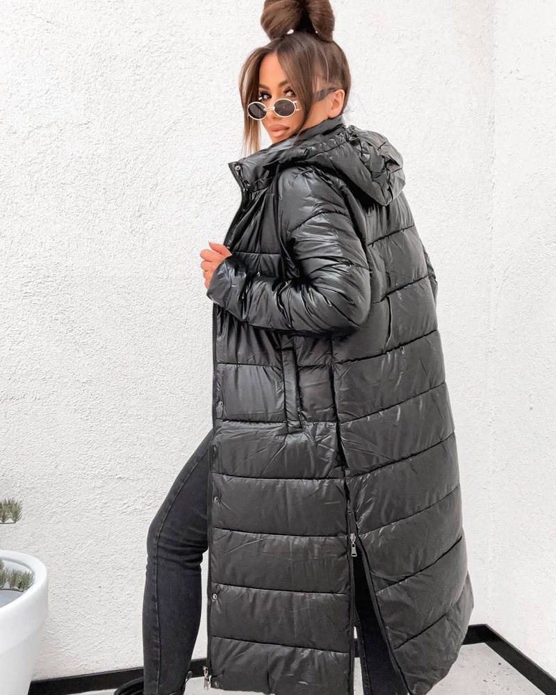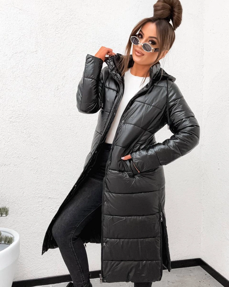 Prosta, pikowana kurtka do kolan z odpinanym kapturem, lekko ocieplona puchem syntetycznym. Zapinana na dwukierunkowy zamek z panelem na napy, wyposażona w dwie kieszenie na napy oraz boczne rozcięcia na zamki dla swobody ruchów. Długi rękaw i długość do kolan zapewniają komfort w chłodniejsze dni.