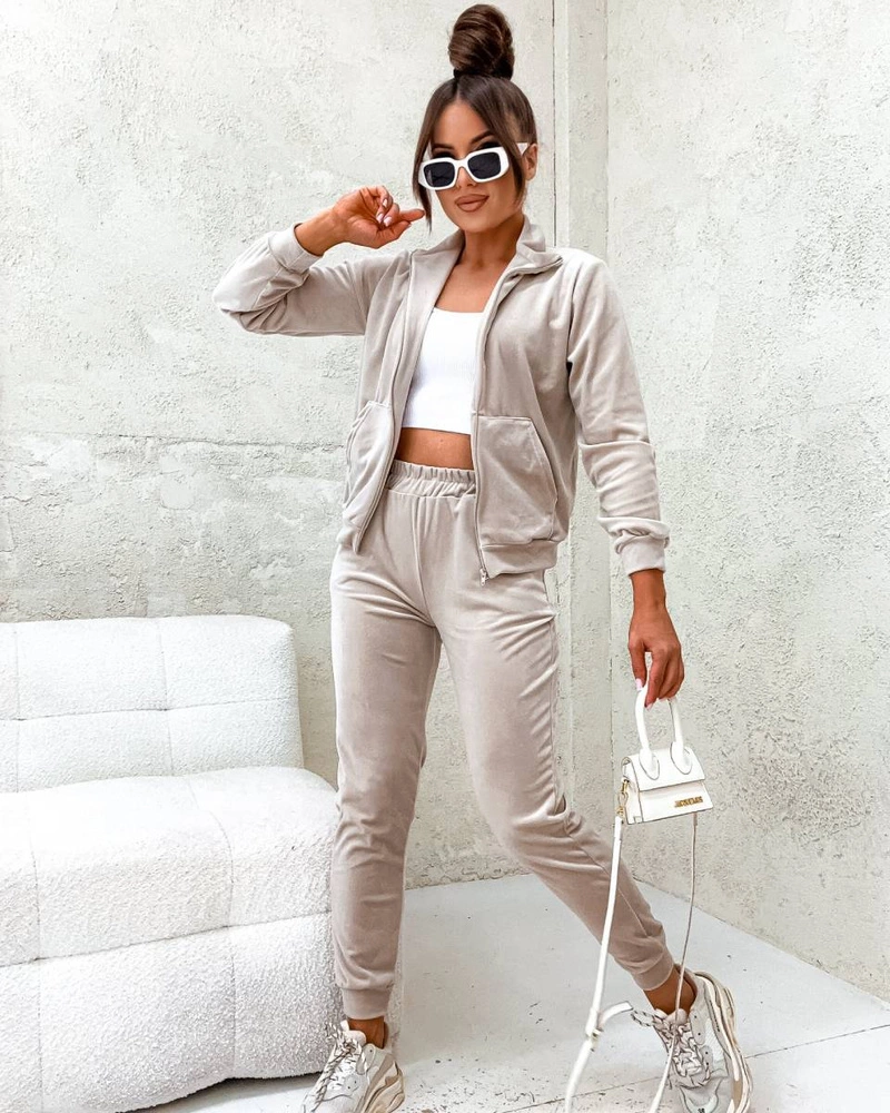 Welurowy komplet dresowy ze stójką beżowy