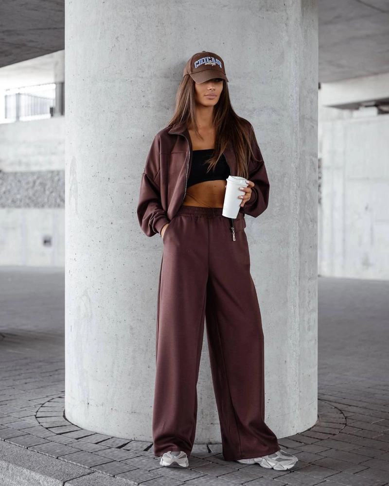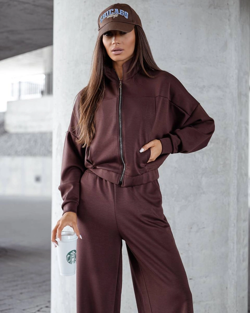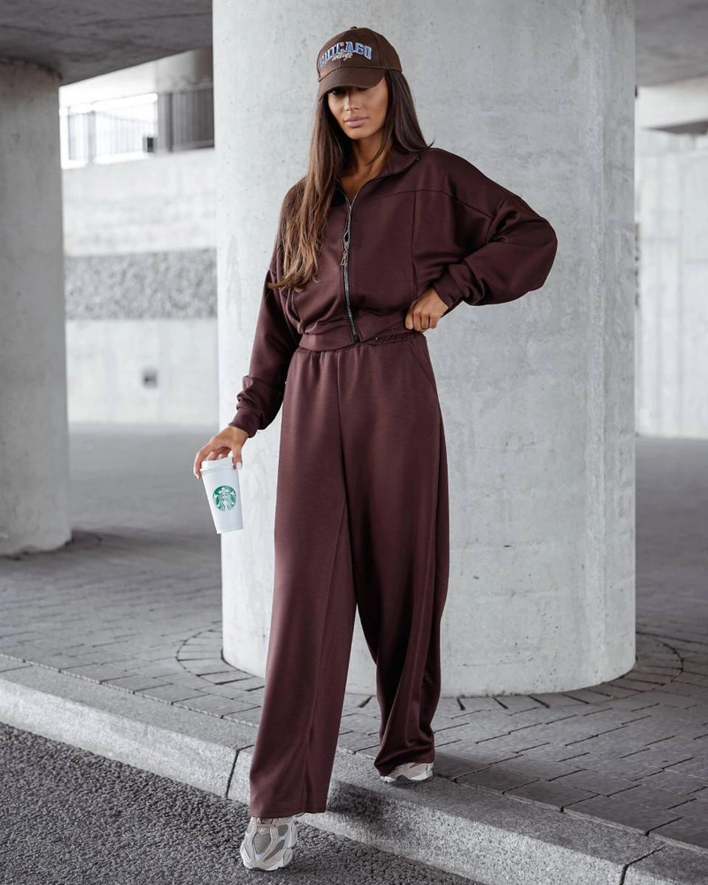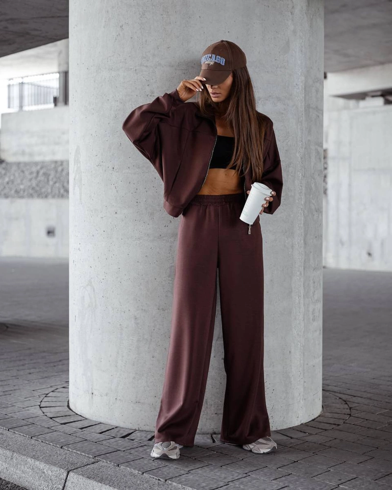 Komfortowy czekoladowy komplet damski bluza + szerokie spodnie