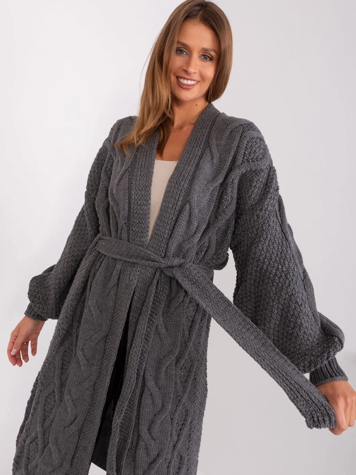 Długi, gruby kardigan w warkoczowy splot z wiązanym paskiem w talii. Posiada długie rękawy i długość do kolan, oferując ciepło, wygodę i stylowy wygląd na chłodne dni.