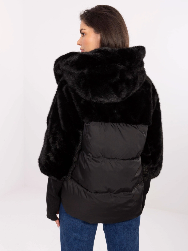 Luźna kurtka z łączonych materiałów, z dzianinowymi rękawami i nieodpinanym kapturem. Lekko ocieplana syntetycznym puchem, z prostym krojem, 2 niezapinanymi kieszeniami, dzianinowymi ściągaczami z wycięciem na kciuk oraz zapięciem na zamek i panel z napami. Długość sięga do bioder, łącząc komfort z nowoczesnym stylem.