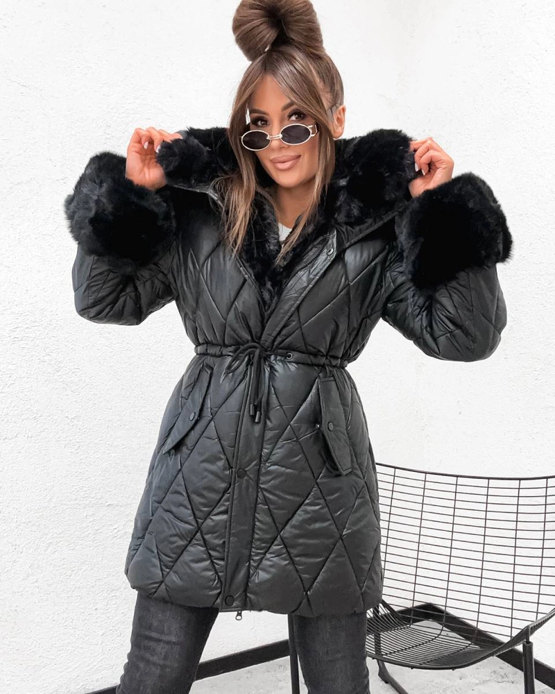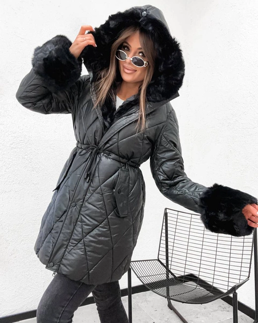 Opinie o Pikowana kurtka zimowa czarna z futrzanym wykończeniem