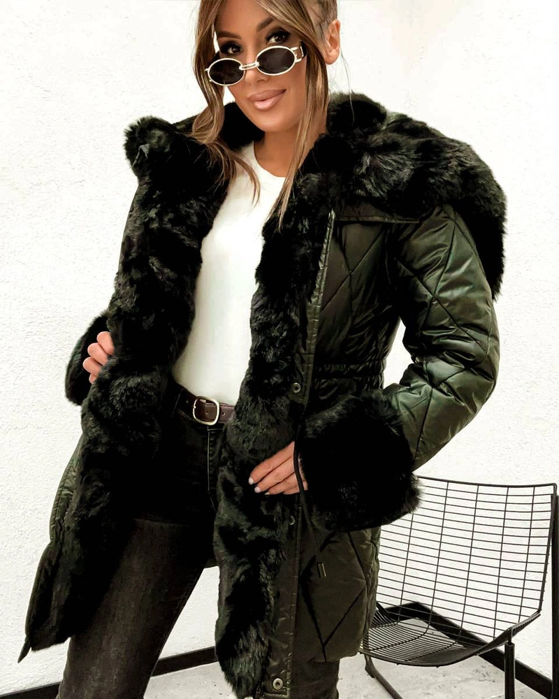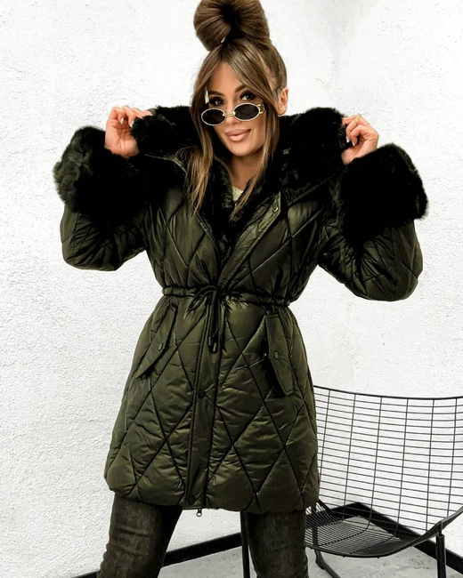 Opinie o Pikowana kurtka zimowa khaki z futrzanym wykończeniem