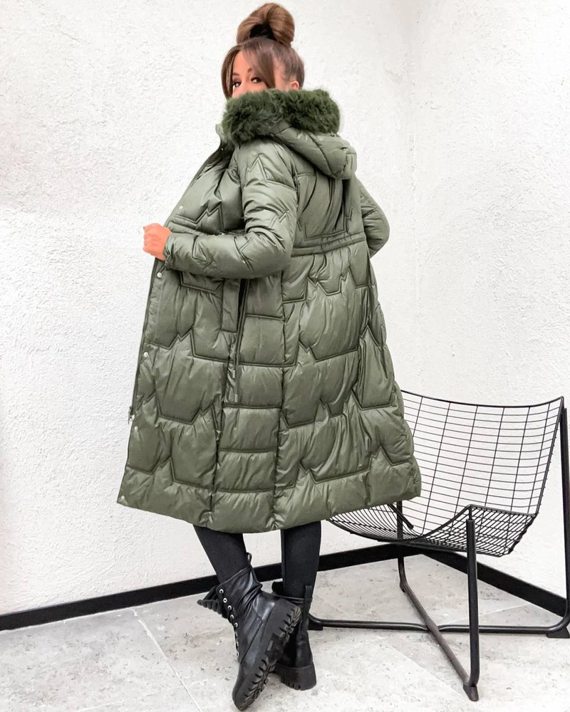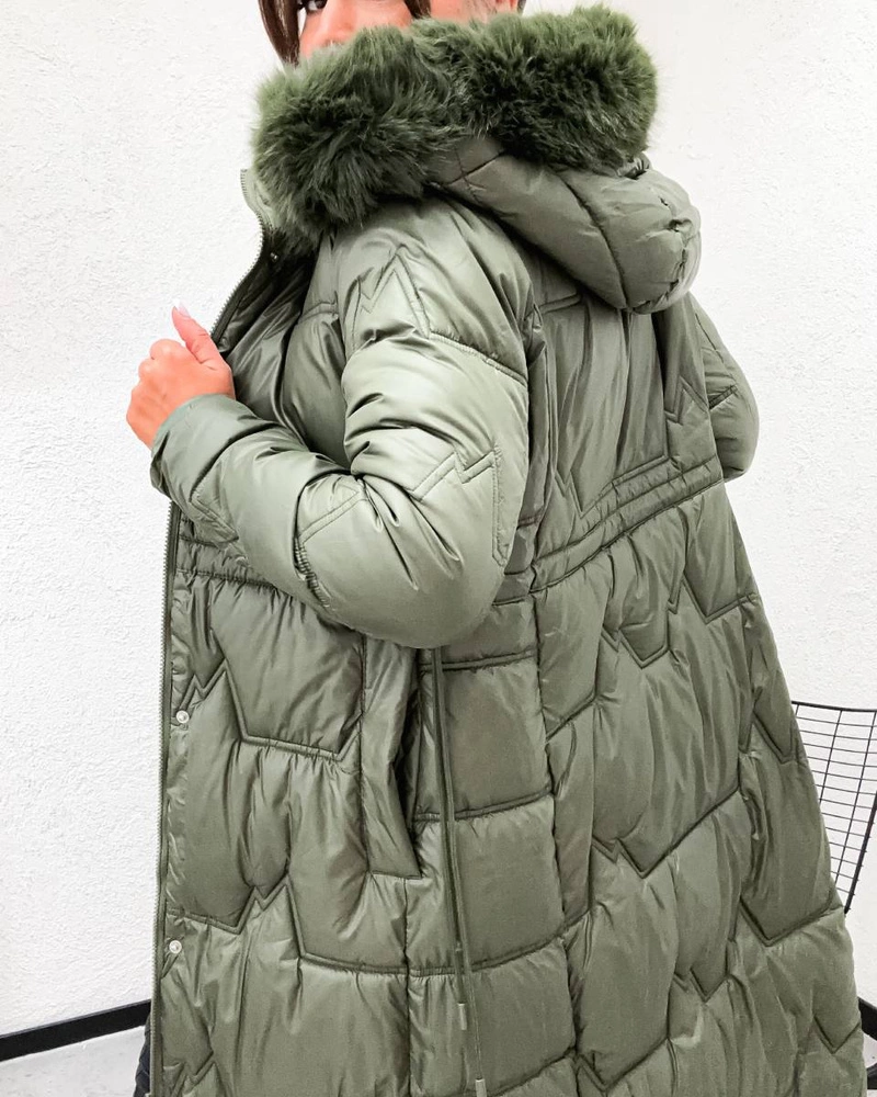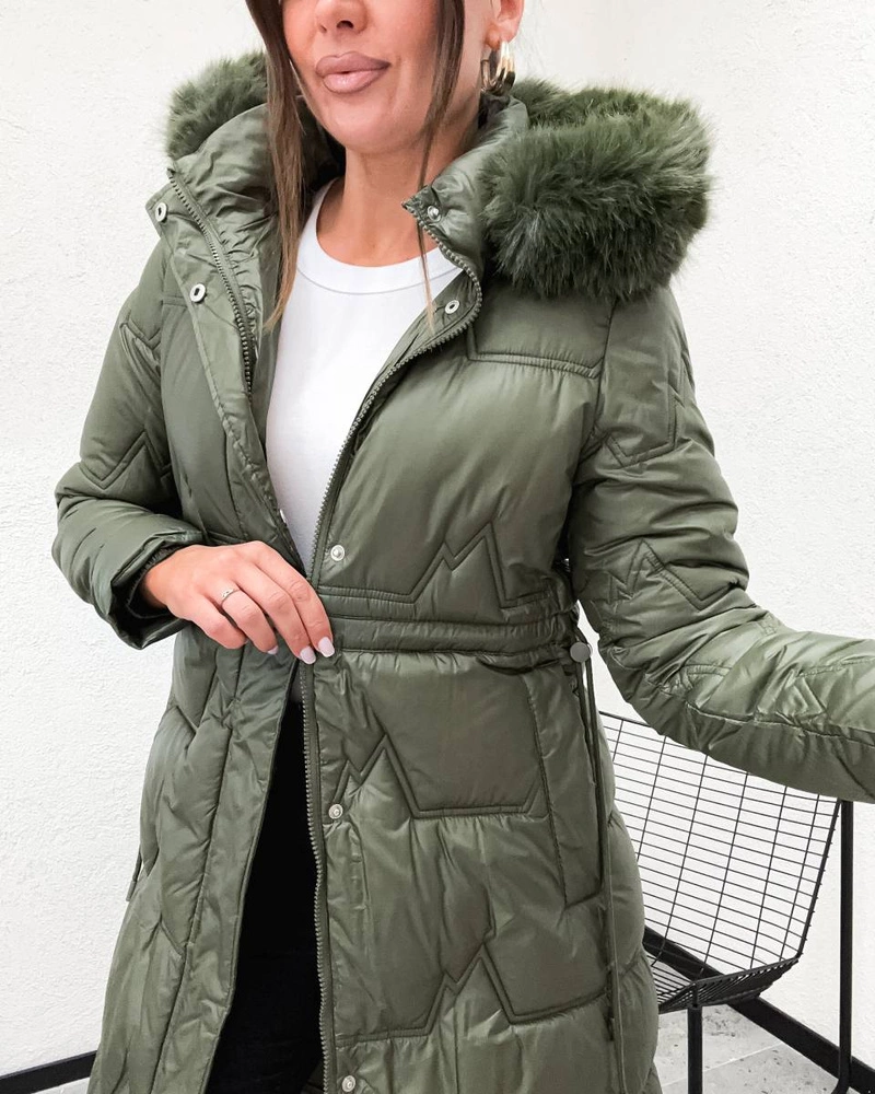 Stylowa, lekko taliowana kurtka zimowa ocieplona puchem syntetycznym, zapewniająca ciepło i komfort. Posiada odpinany kaptur z futerkiem, dwukierunkowy zamek z panelem na napy oraz trok ściągający w talii, który podkreśla sylwetkę. Dwie niezapinane kieszenie dodają funkcjonalności, a długość poniżej kolan gwarantuje doskonałą ochronę przed zimnem.