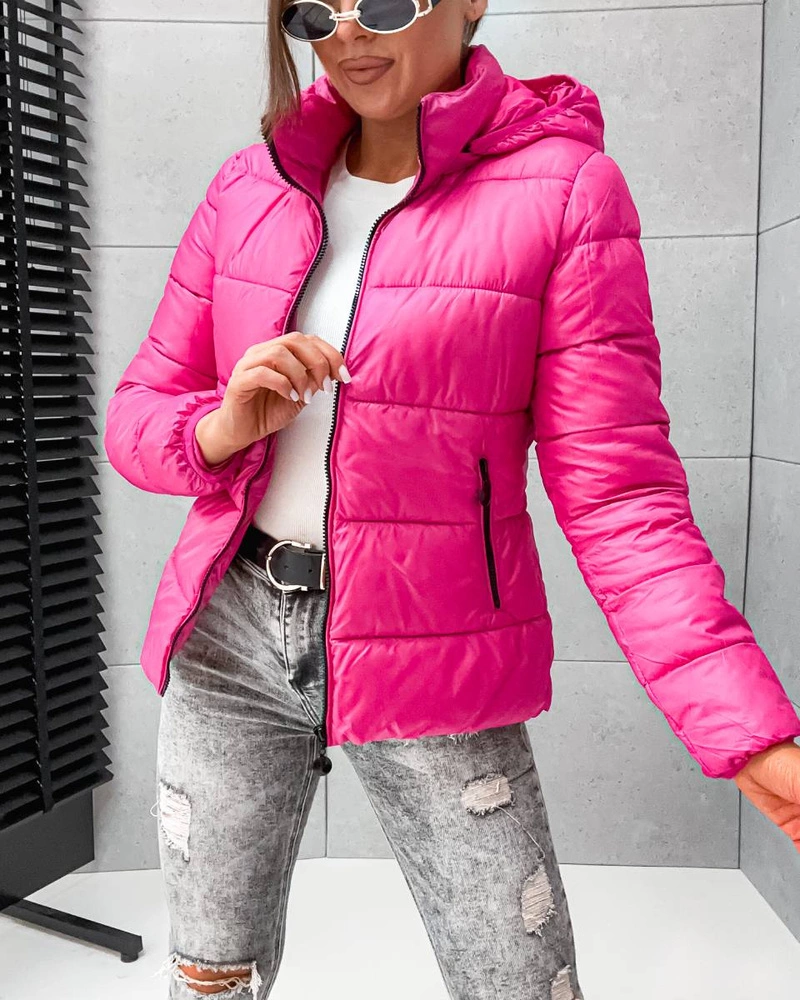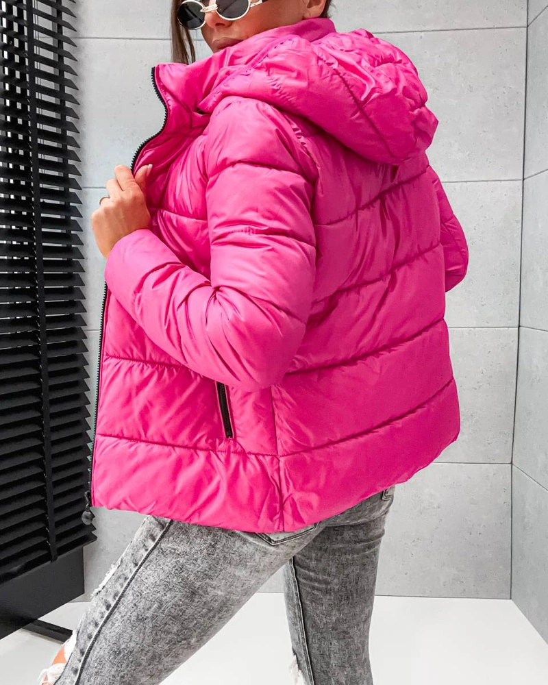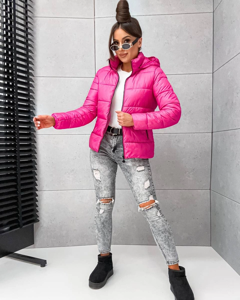 Lekko taliowana kurtka zimowa do bioder, ocieplona puchem syntetycznym. Wyposażona w praktyczną stójkę, odpinany kaptur oraz zamek na całej długości. Rękawy wykończone elastyczną lamówką zapewniają wygodne dopasowanie, a dwie kieszenie dodają funkcjonalności. Idealna na chłodniejsze dni.
