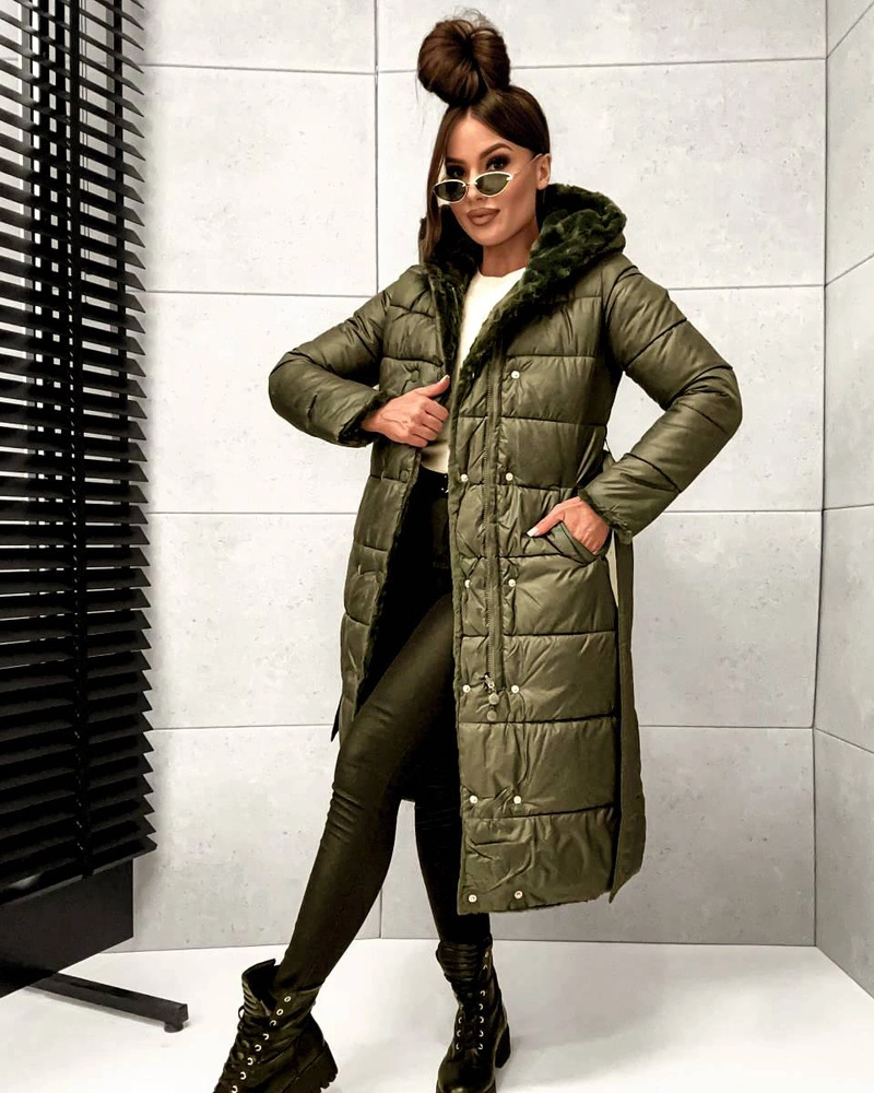 Zimowa kurtka dwustronna – jedna strona pikowana, druga z futerkiem, łączy ciepło z modnym stylem. Odpinany kaptur, ocieplenie syntetycznym puchem, dwukierunkowy zamek oraz dwie niezapinane kieszenie zapewniają wygodę i funkcjonalność. Długość poniżej kolan gwarantuje ochronę przed zimnem.