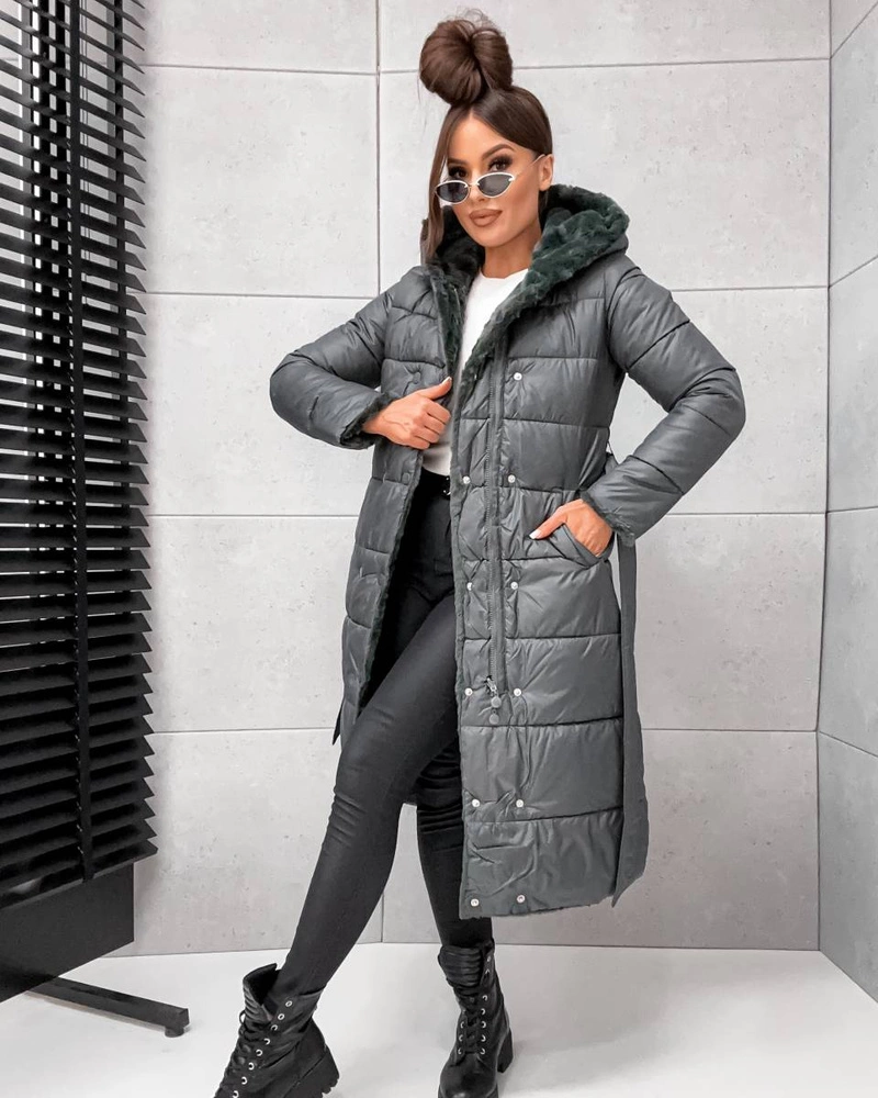 Zimowa kurtka dwustronna – jedna strona pikowana, druga z futerkiem, łączy ciepło z modnym stylem. Odpinany kaptur, ocieplenie syntetycznym puchem, dwukierunkowy zamek oraz dwie niezapinane kieszenie zapewniają wygodę i funkcjonalność. Długość poniżej kolan gwarantuje ochronę przed zimnem.