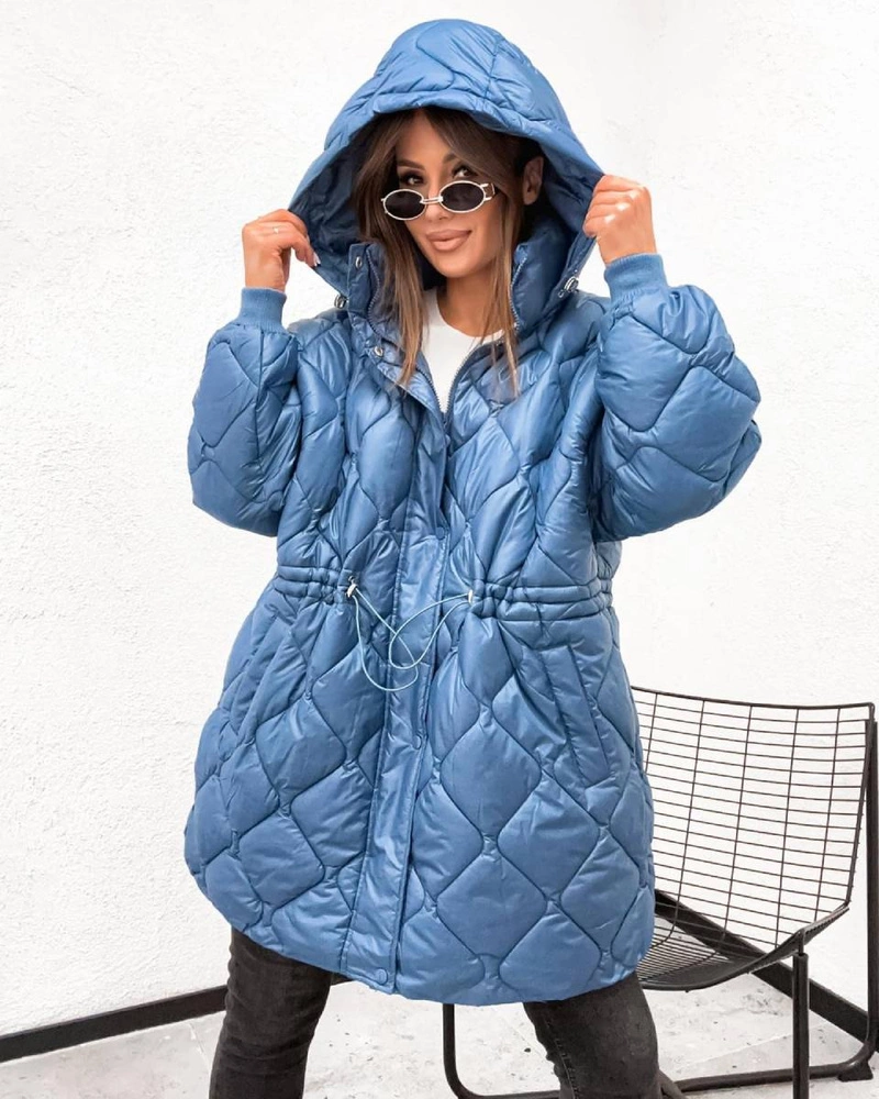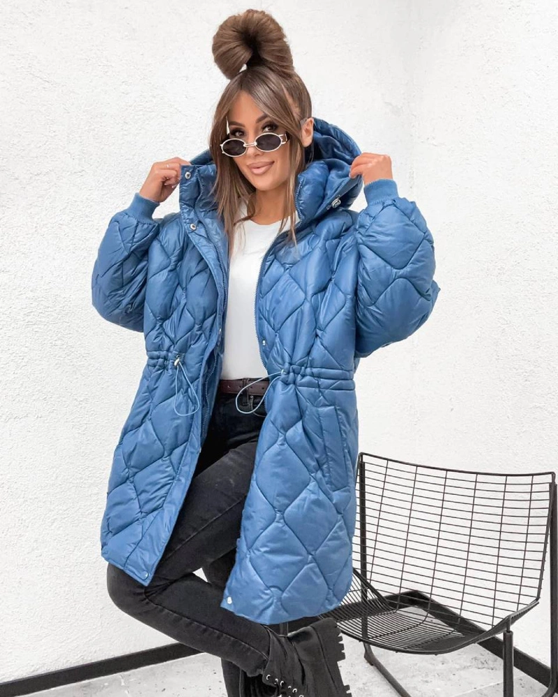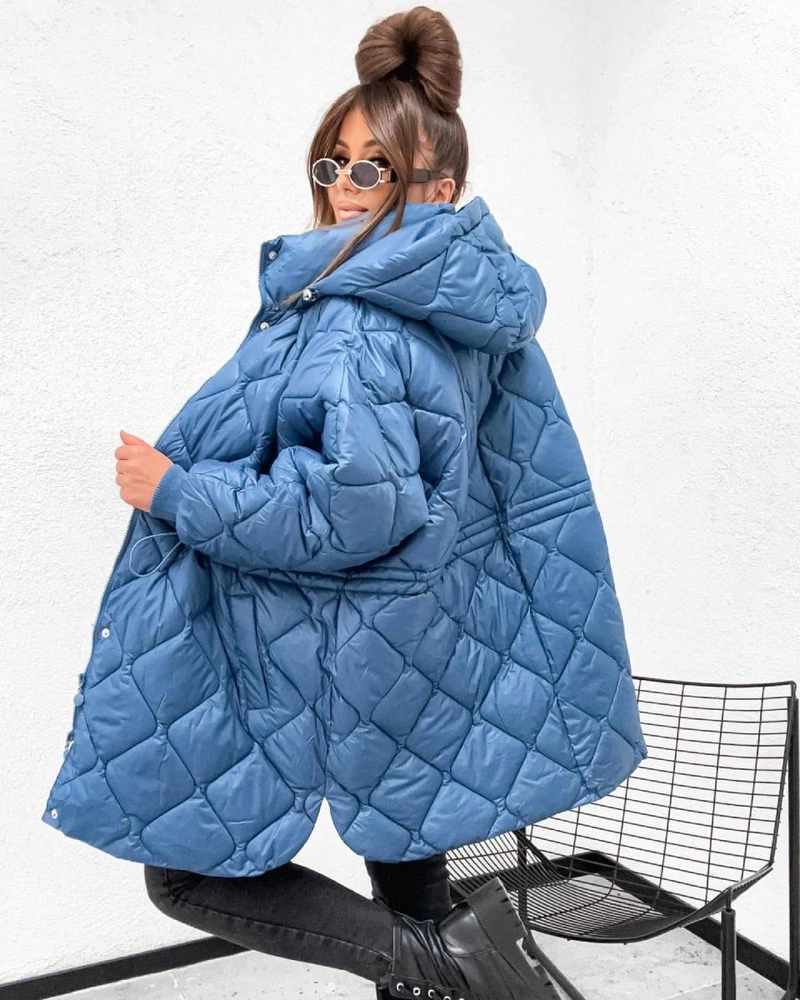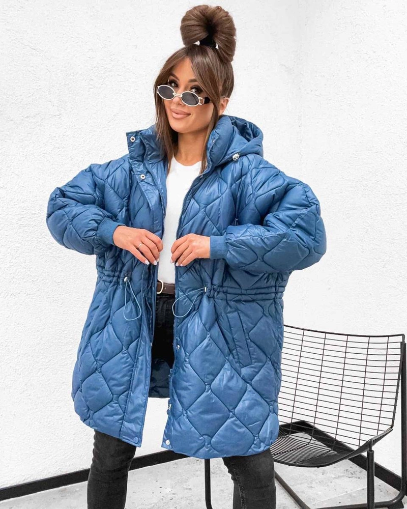 Luźna, pikowana kurtka z nieodpinanym kapturem niebieska
