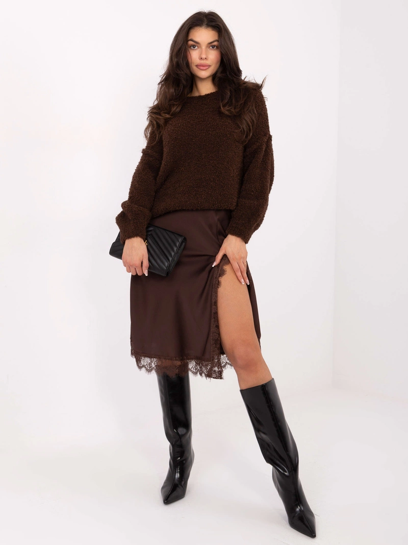 Elegancka, satynowa spódnica o prostym kroju. Wykończona delikatną koronką, z wygodną gumką w pasie. Posiada subtelne rozcięcie na lewym kolanie, które dodaje lekkości i kobiecości. Długość za kolano sprawia, że idealnie sprawdzi się zarówno na co dzień, jak i na wyjątkowe okazje.