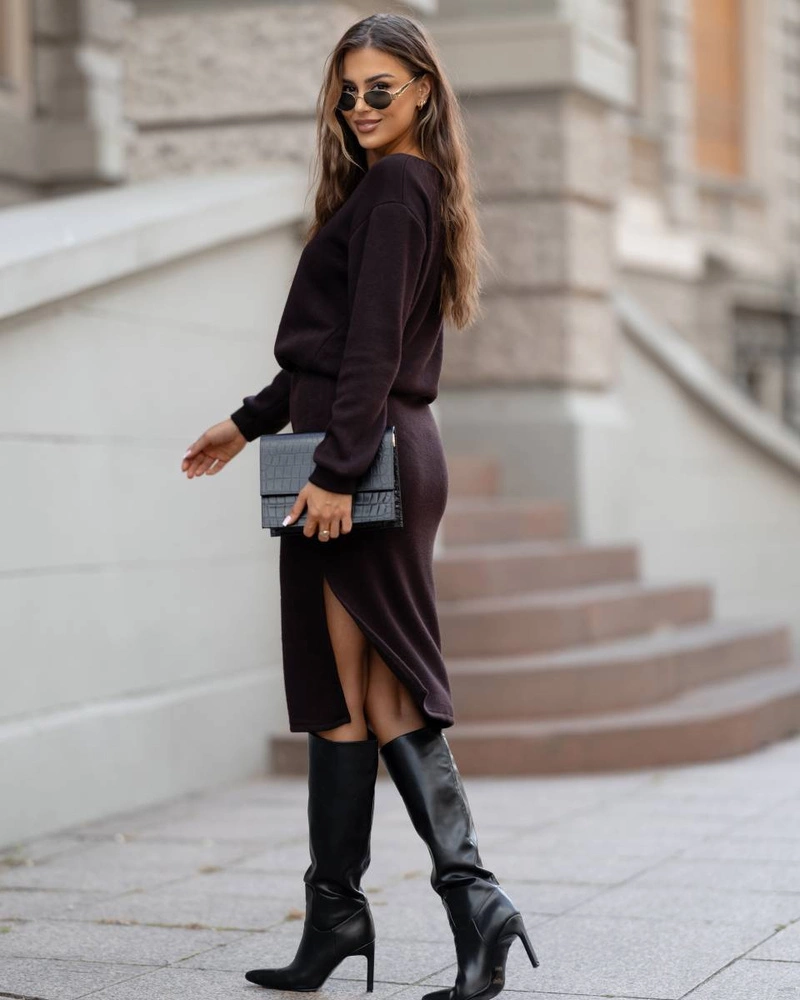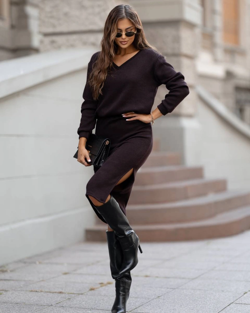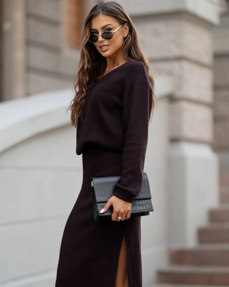 Opinie o Dzianinowy czekoladowy zestaw bluzka + spódnica