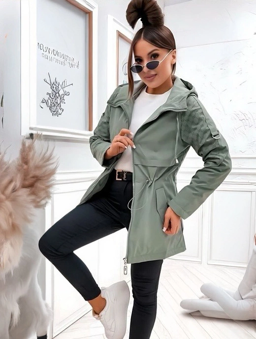 Lekka damska kurtka z monogramem, wyposażona w nieodpinany kaptur i delikatne ocieplenie z puchu syntetycznego. Zapinana na elegancki czarno-srebrny zamek, posiada dwie niezapinane kieszenie oraz trok ściągający w talii, który podkreśla sylwetkę. Prosty krój i długość sięgająca poniżej bioder zapewniają komfort oraz uniwersalny, stylowy wygląd.