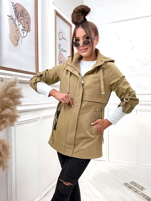 Lekka damska kurtka z kapturem i podwijanymi rękawami, idealna na wiosnę i jesień. Posiada odpinany kaptur, zamek z panelem na napy, dwie niezapinane kieszenie oraz troczek w talii do regulacji szerokości. Prosty krój i długość do bioder gwarantują wygodę i swobodę ruchów.