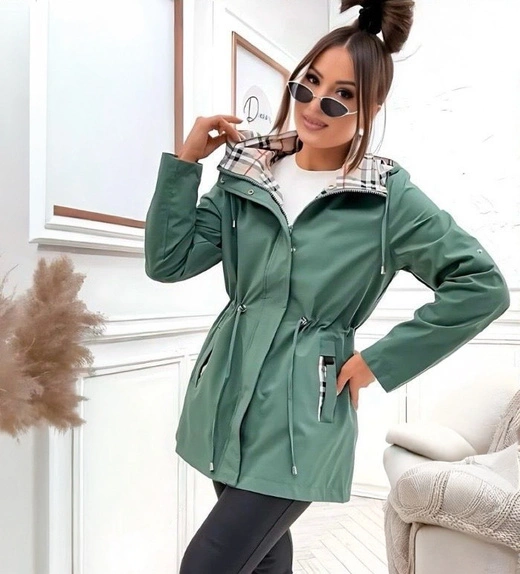 Lekka damska kurtka z nieodpinanym kapturem, zapinana na zamek i panel z napami. Wyposażona w dwie otwarte kieszenie oraz troki ściągające w talii, które podkreślają sylwetkę. Prosty krój i wykończenie w kratkę nadają jej casualowy charakter, a długość poniżej bioder zapewnia dodatkowy komfort i osłonę.