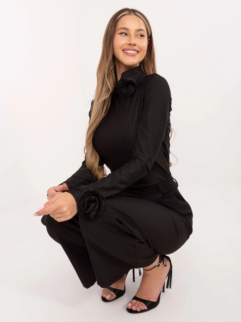 Elegancka wizytowa bluzka z różami, wykonana z elastycznego materiału, zapewnia wygodę i idealne dopasowanie. Golf oraz długi rękaw dodają szyku, a ozdobne wykończenia podkreślają wyjątkowy charakter modelu. Długość sięga do bioder, dzięki czemu świetnie komponuje się zarówno ze spódnicami, jak i spodniami.