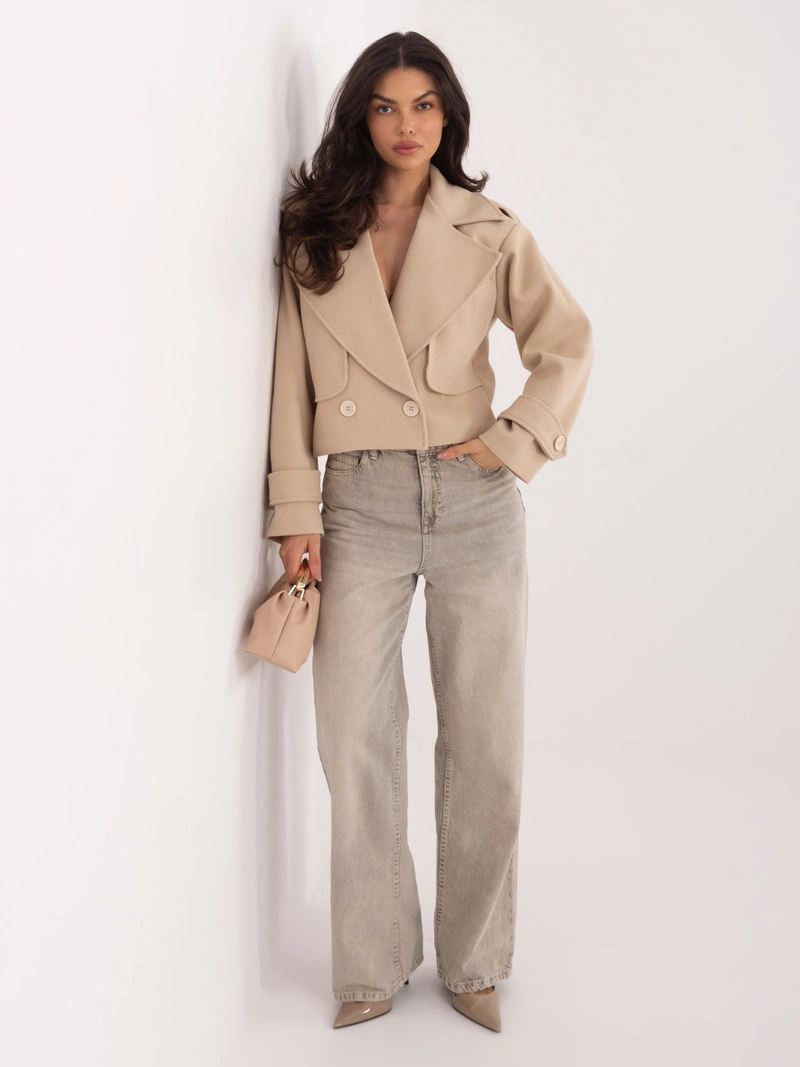 Krótka kurtka o fasonie marynarki, na podszewce. Model z pagonami i klasycznymi klapami, zapinany na guzik. Długość poniżej pasa nadaje całości elegancki, a zarazem nowoczesny charakter.