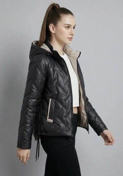 Czarna pikowana kurtka z beżowym wykończeniem
